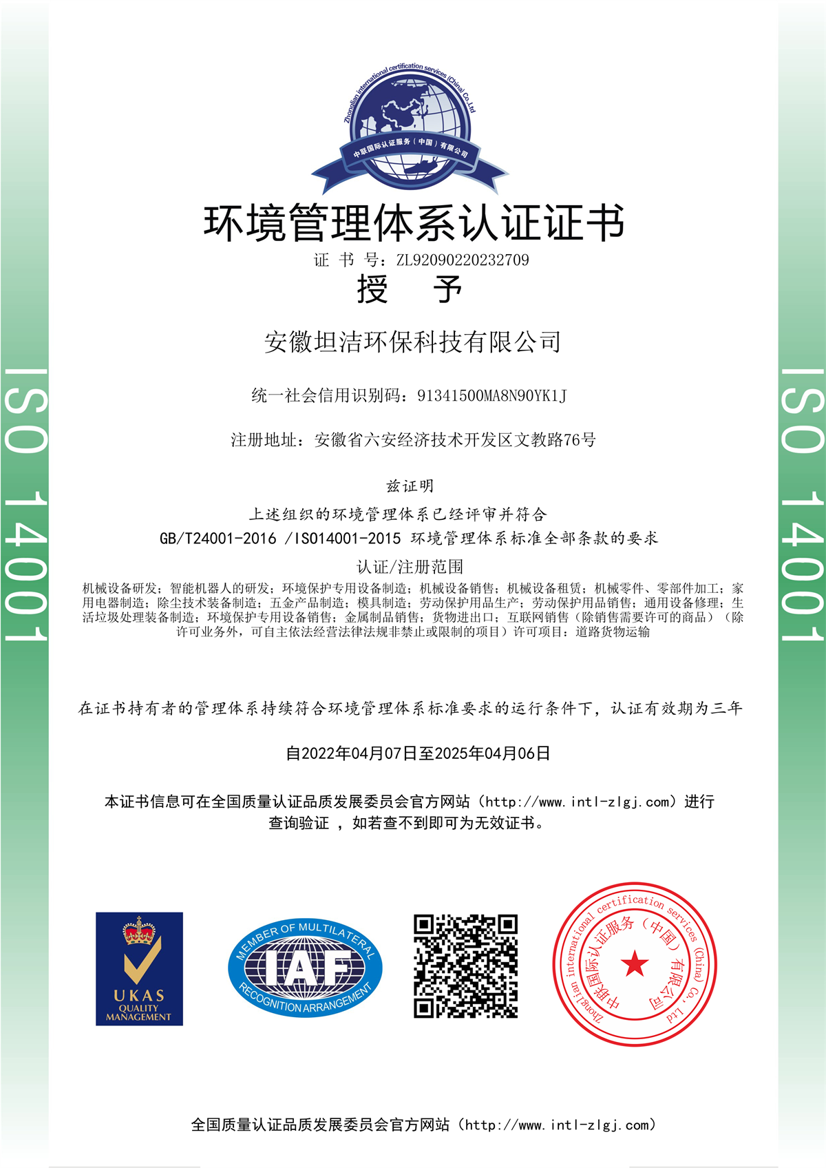 元朗环境管理体系认证证书